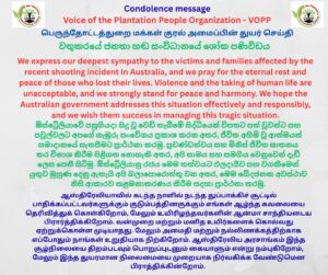 ஆஸ்திரேலியாவில் கடந்த நாளில் நடந்த துப்பாக்கிச் சூட்டில் பாதிக்கப்பட்டவர்களுக்கும் குடும்பத்தினருக்கும் எங்கள் ஆழ்ந்த கவலையை தெரிவித்துக் கொள்கிறோம், மேலும் உயிரிழந்தவர்களின் ஆன்மா சாந்தியடைய பிரார்த்திக்கிறோம். வன்முறை மற்றும் மனித உயிர்களைக் கொல்வது ஏற்றுக்கொள்ள முடியாதது. மேலும் அமைதி மற்றும் நல்லிணக்கத்திற்காக எப்போதும் நாங்கள் உறுதியாக நிற்கிறோம். ஆஸ்திரேலிய அரசாங்கம் இந்த சூழ்நிலையை திறம்படவும் பொறுப்புடனும் கையாளும் என்று நம்புகிறோம், மேலும் இந்த துயரமான நிலைமையை முறையாக நிர்வகிக்க வேண்டுமென பிராத்திக்கின்றோம்.