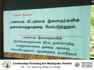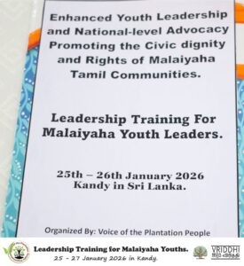 The Voice of the Plantation People Organization (VOPP) successfully conducted a leadership training programme for selected Malaiyaha youth from Matara, Galle, Kalutara, Kandy, Nuwara Eliya, Ratnapura, and Badulla districts.