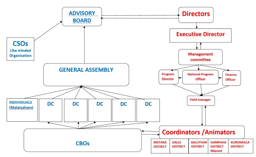 • District Coordinators / Animators: Operate in Matara, Galle, Kalutara, Gampaha (Migrant), and Kurunegala districts. They carry out community mobilization, facilitate programs, and act as liaisons between communities and the organization.